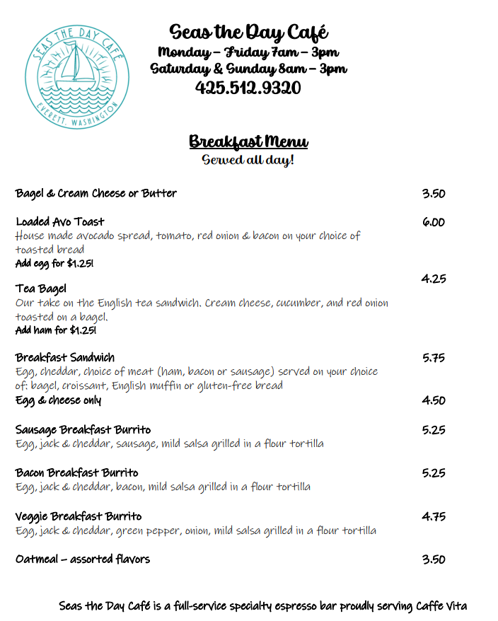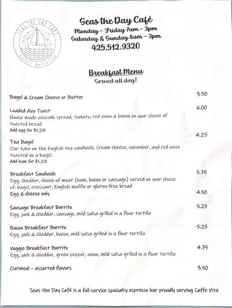 Seas the Day Cafe, located in the picturesque Everett, WA, invites you to savor a delightful array of sandwiches that cater to various tastes. Whether you're craving a classic Reuben or a hearty breakfast burrito sandwich, the menu promises quality and flavor at an affordable price.